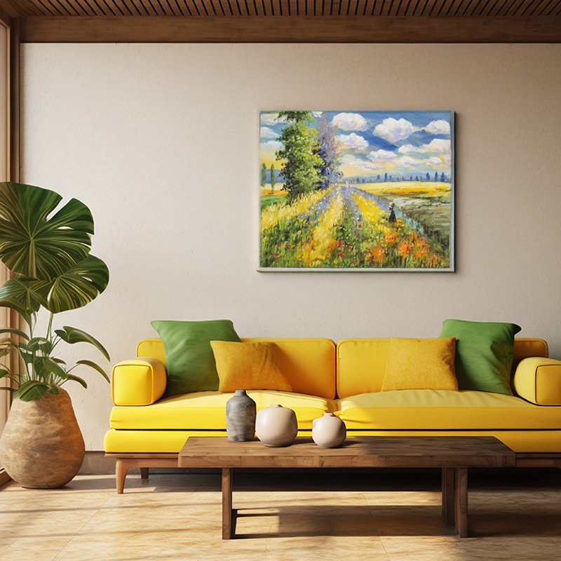 Transport yourself to a picturesque countryside with this stunning Vibrant Countryside Canvas Painting, a celebration of nature’s beauty and serenity. The artwork captures a golden meadow dotted with vibrant wildflowers, framed by lush green trees and a tranquil path that winds into the horizon. The expansive sky, painted with soft white clouds and hints of sunshine, enhances the scene’s idyllic charm.