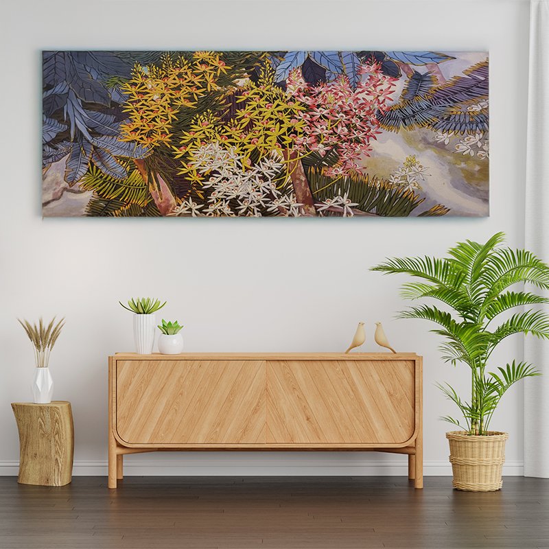 Celebrate the vibrancy and diversity of nature with this exquisite Botanical Oil on Canvas, a stunning representation of blooming flora. This artwork captures a mesmerizing blend of yellow, pink, and white blossoms, set amidst lush green foliage and intricate leaf patterns. The fine detailing and vivid oil paints create a dynamic and lifelike portrayal of nature’s beauty, bringing every petal and leaf to life with depth and richness.
