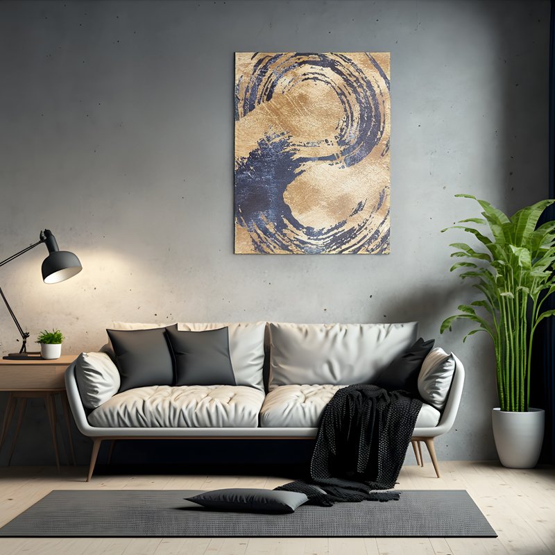 Elevate your interiors with this Golden Swirl Abstract Painting on Canvas, featuring bold circular patterns in radiant gold and deep blue tones. This captivating artwork exudes sophistication and modernity, making it an impeccable choice for contemporary living spaces or luxury offices.
