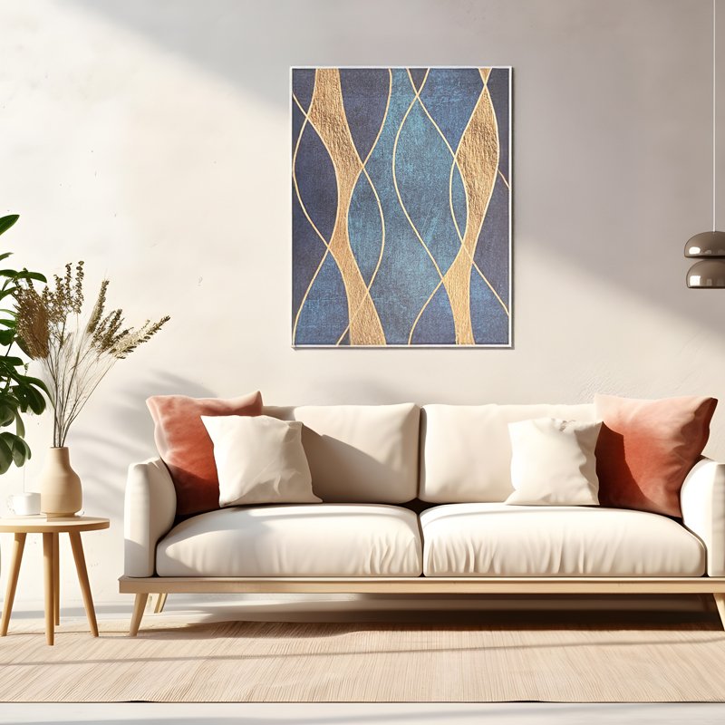 Elevate your décor with this Modern Abstract Painting on Canvas, featuring elegant wave-like patterns in shimmering gold set against a textured deep blue background. The harmonious design and luxurious finish make it a perfect statement piece for sophisticated interiors. Ideal for living rooms, offices, or contemporary art collections.