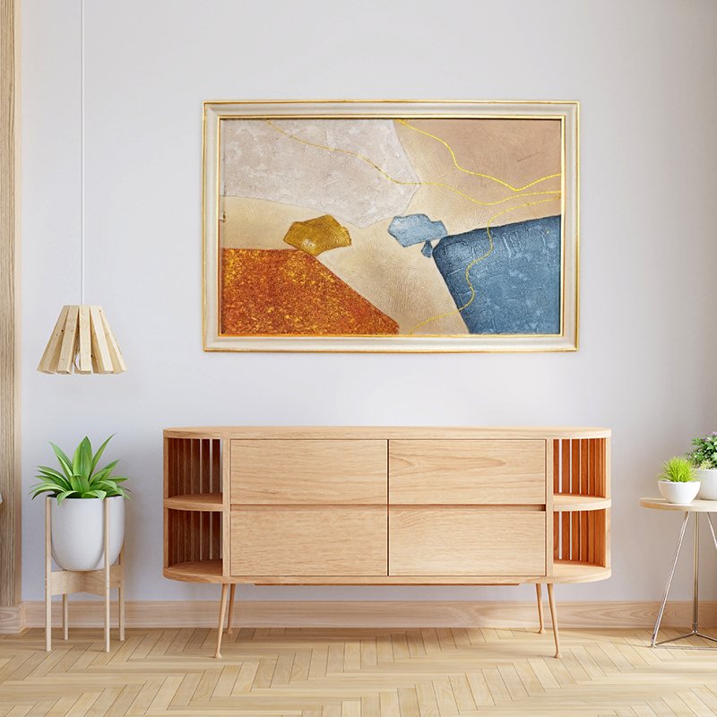 This exquisite abstract painting on canvas redefines modern art with its harmonious interplay of geometric shapes and luxurious textures. The artwork features a captivating palette of vibrant orange, metallic gold, muted beige, and deep blue, creating a dynamic visual contrast. Golden accents thread through the composition, adding a sense of fluidity and richness that elevates the design.