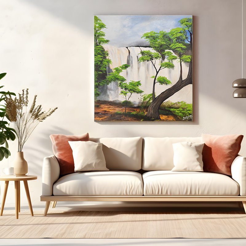 Experience the soothing charm of nature with this stunning Waterfall Landscape Painting on Canvas, a masterpiece that captures the serenity and grandeur of a cascading waterfall. Surrounded by vibrant green trees and set against a soft blue sky, this artwork evokes a sense of peace and connection with the natural world. The realistic details, from the flowing water to the textured tree trunks, showcase the artist’s skill and dedication.